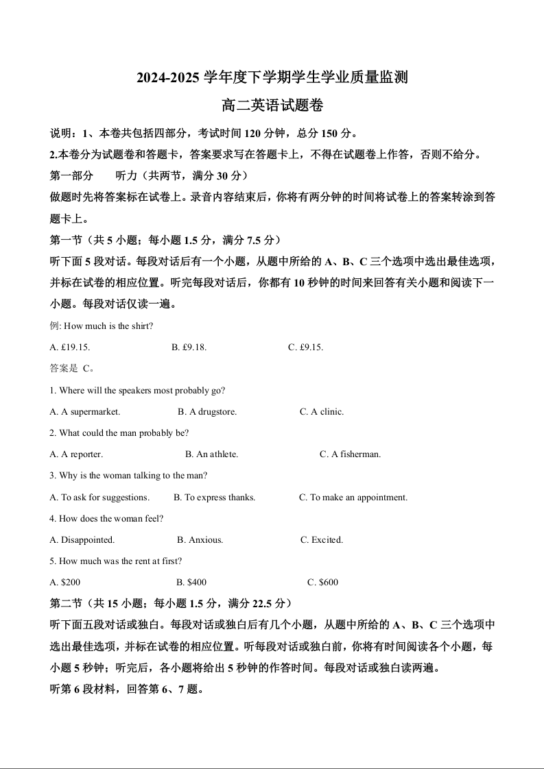 高二英语+答案--江西省抚州市2024-2025学年高二下学期期末考试