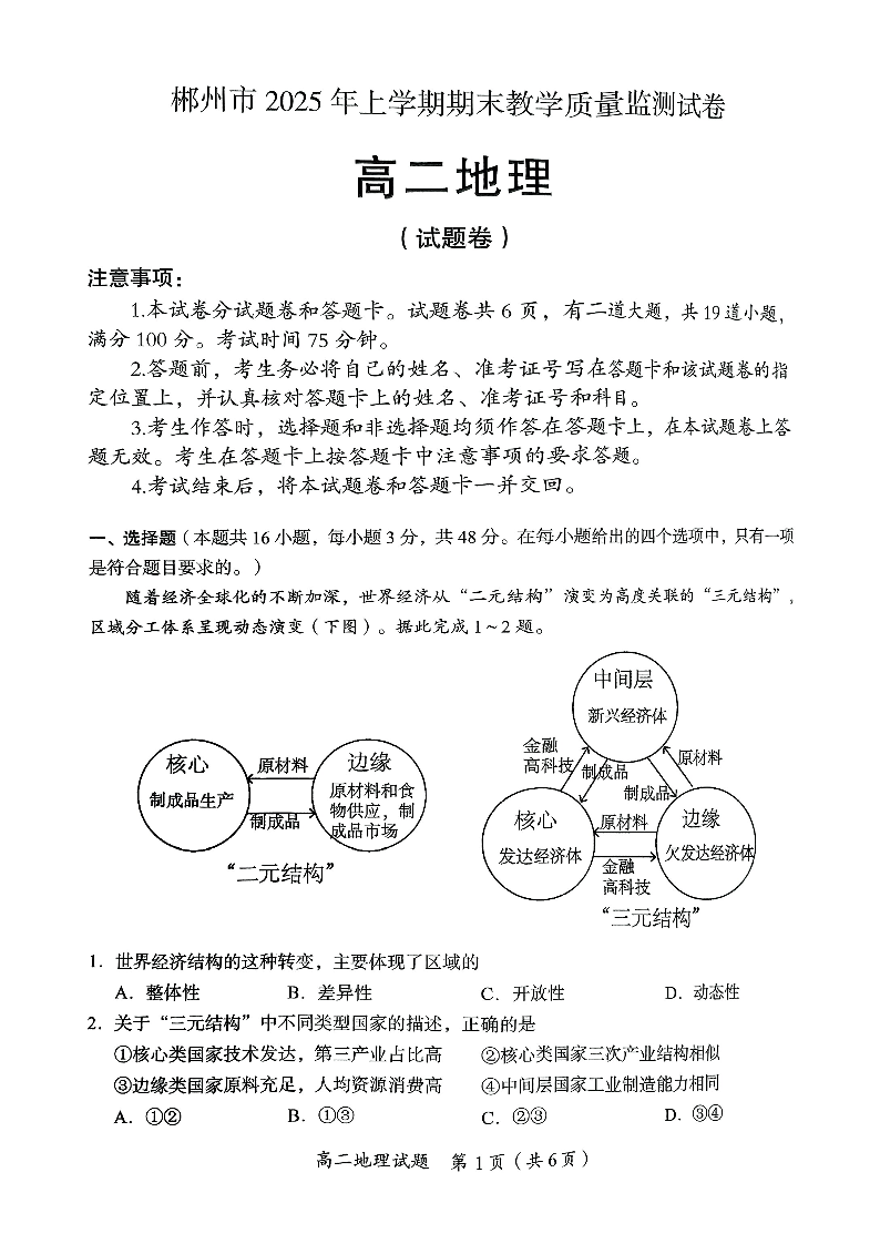 高二地理--湖南省郴州市2024-2025学年高二下学期期末教学质量监测