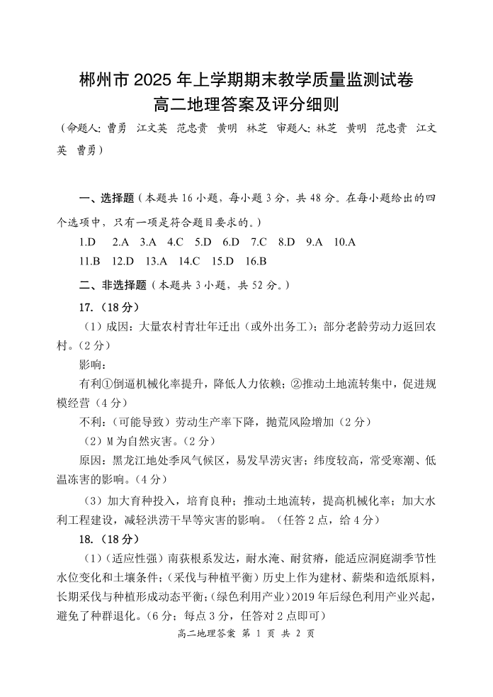 高二地理答案--湖南省郴州市2024-2025学年高二下学期期末教学质量监测