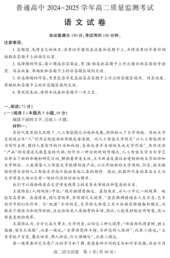 高二语文--湖北省恩施州普通高中2024-2025学年高二质量监测考试