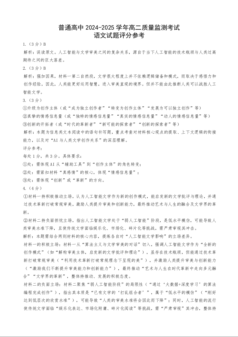 高二语文答案--湖北省恩施州普通高中2024-2025学年高二质量监测考试