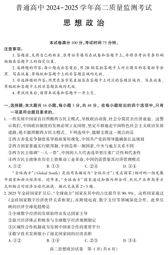 高二政治--湖北省恩施州普通高中2024-2025学年高二质量监测考试