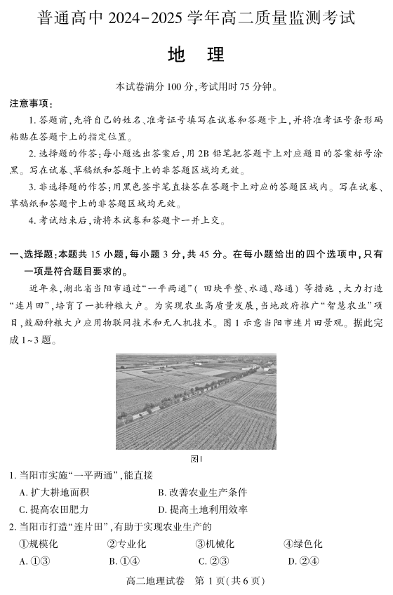 高二地理--湖北省恩施州普通高中2024-2025学年高二质量监测考试