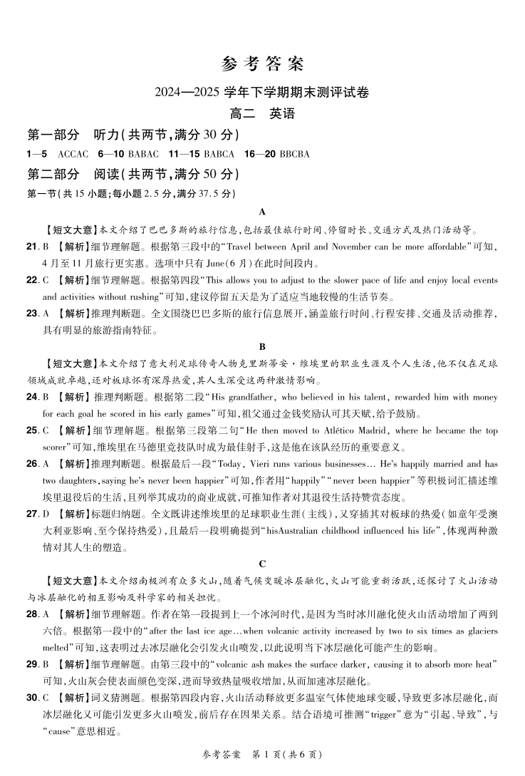 高二英语答案--河南省安阳市滑县2024-2025学年高二下学期期末测评