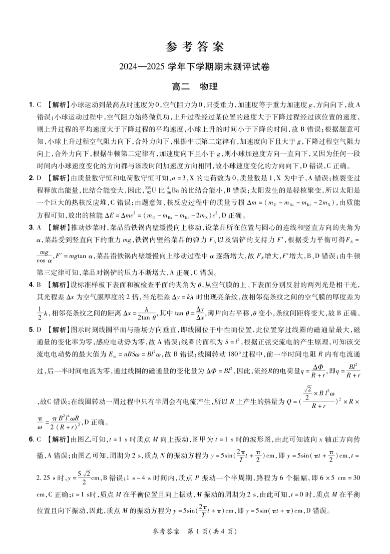 高二物理答案--河南省安阳市滑县2024-2025学年高二下学期期末测评
