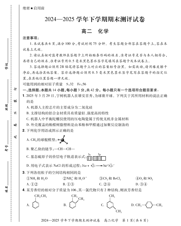 高二化学--河南省安阳市滑县2024-2025学年高二下学期期末测评