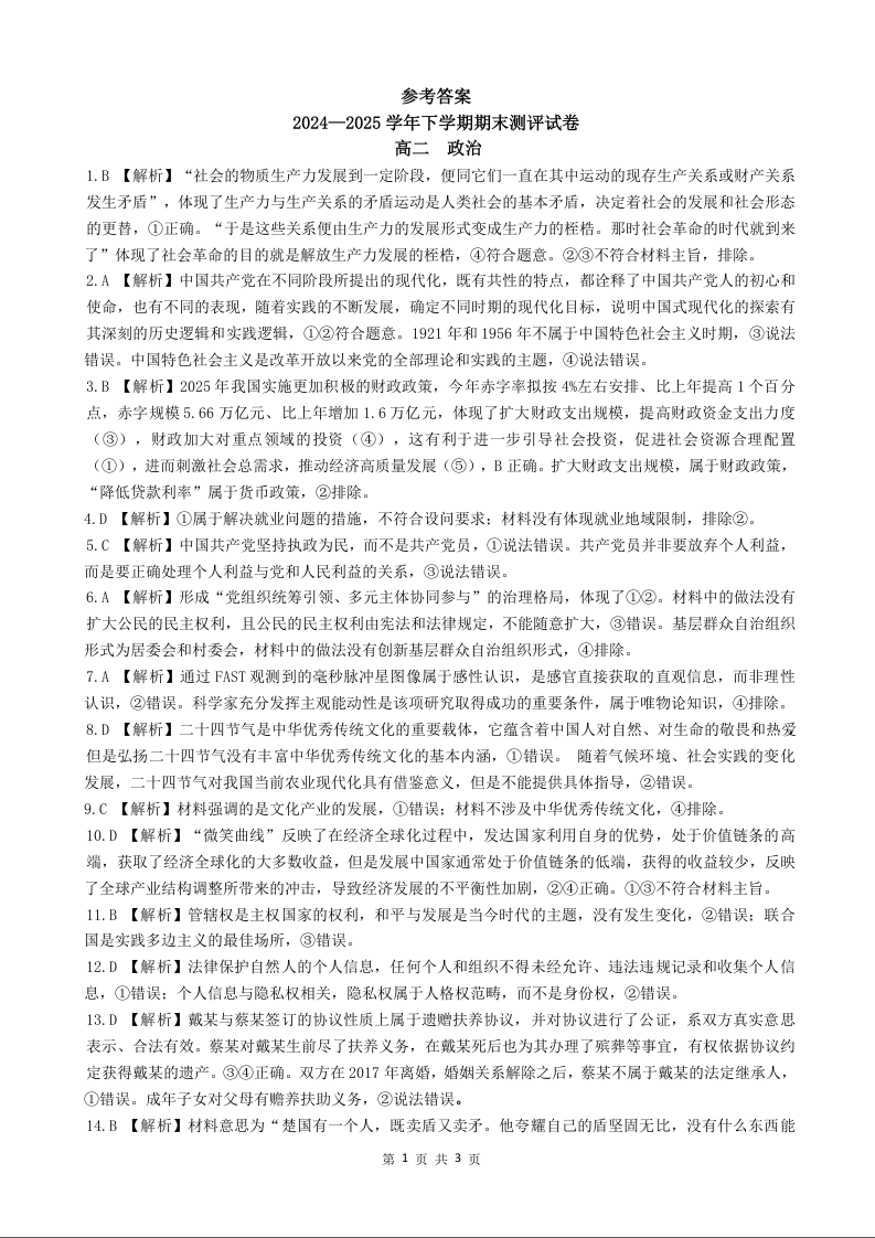 高二政治答案--河南省安阳市滑县2024-2025学年高二下学期期末测评