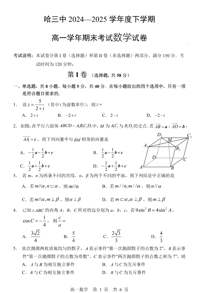 高一数学--黑龙江省哈尔滨第三中学2024-2025学年度下学期高一学年期末考试