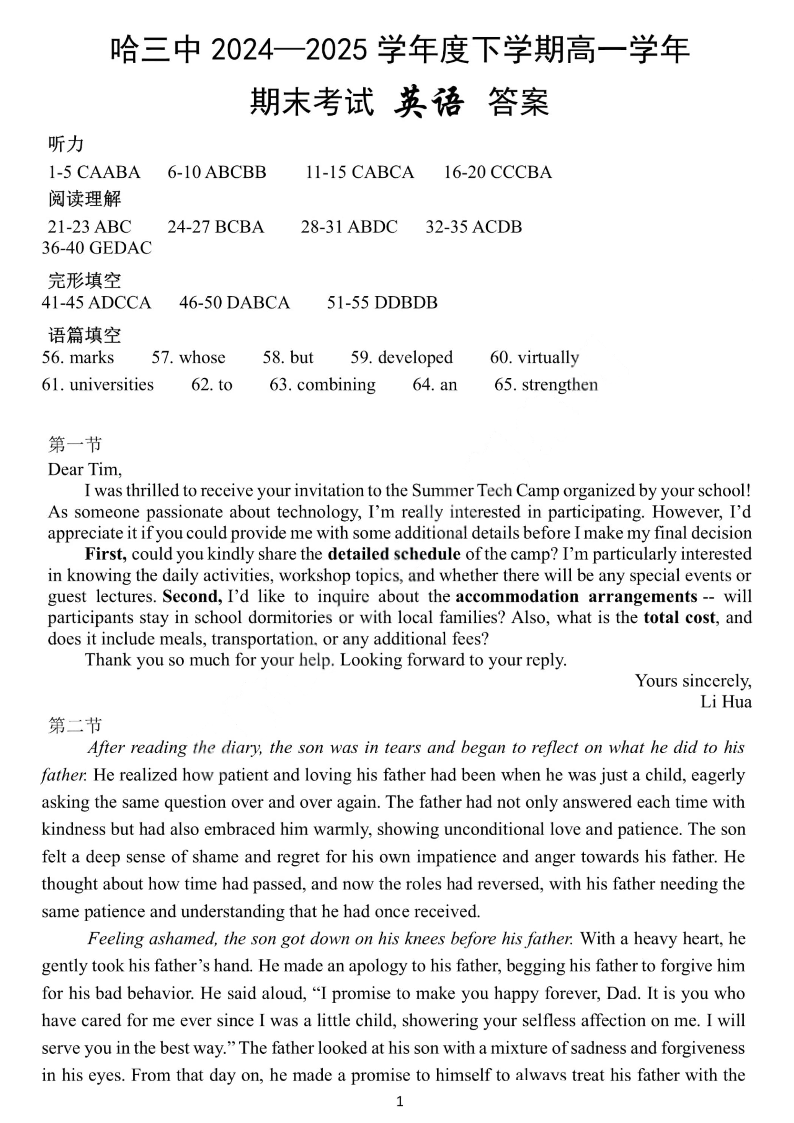高一英语答案--黑龙江省哈尔滨第三中学2024-2025学年度下学期高一学年期末考试