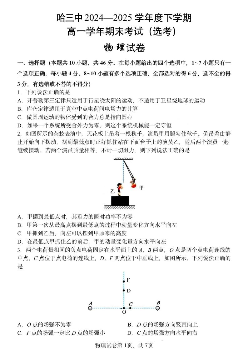 高一物理--黑龙江省哈尔滨第三中学2024-2025学年度下学期高一学年期末考试