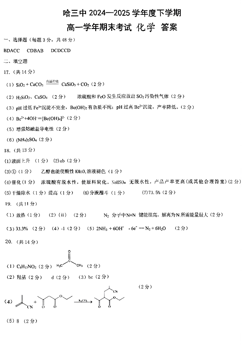 高一化学答案--黑龙江省哈尔滨第三中学2024-2025学年度下学期高一学年期末考试