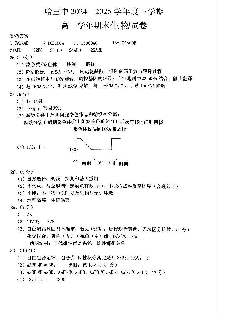 高一生物答案--黑龙江省哈尔滨第三中学2024-2025学年度下学期高一学年期末考试