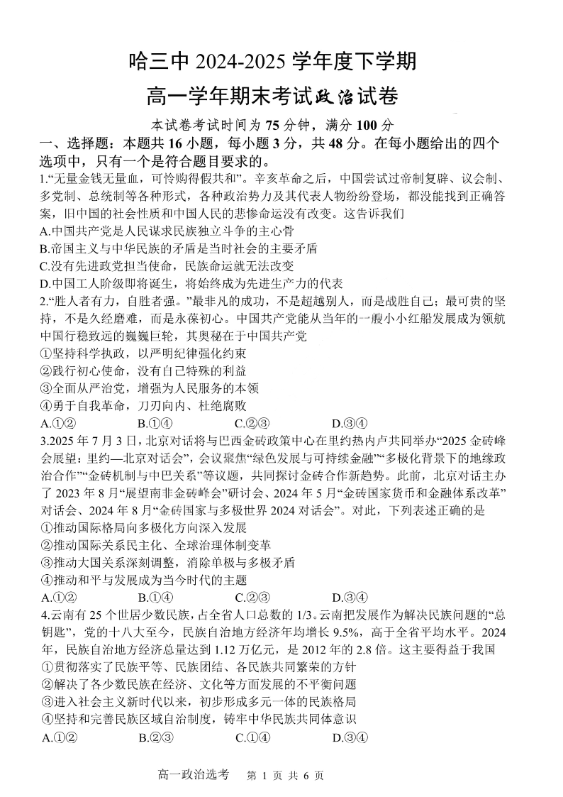 高一政治--黑龙江省哈尔滨第三中学2024-2025学年度下学期高一学年期末考试