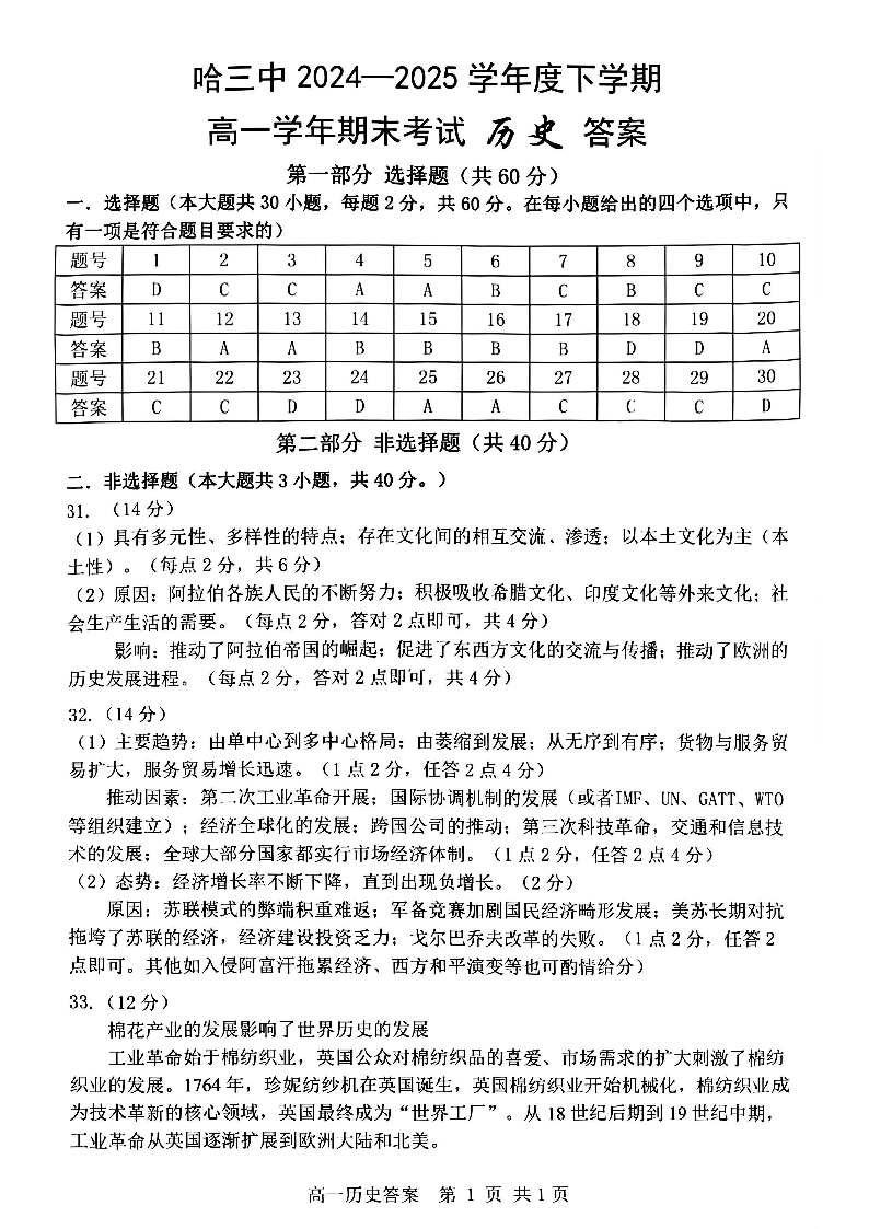 高一历史答案--黑龙江省哈尔滨第三中学2024-2025学年度下学期高一学年期末考试--水印