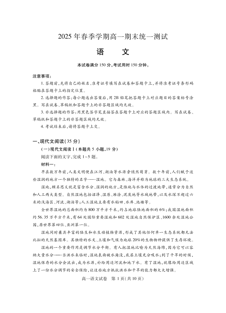 高一语文--湖北省黄石市2025春季学期高一期末统一测试