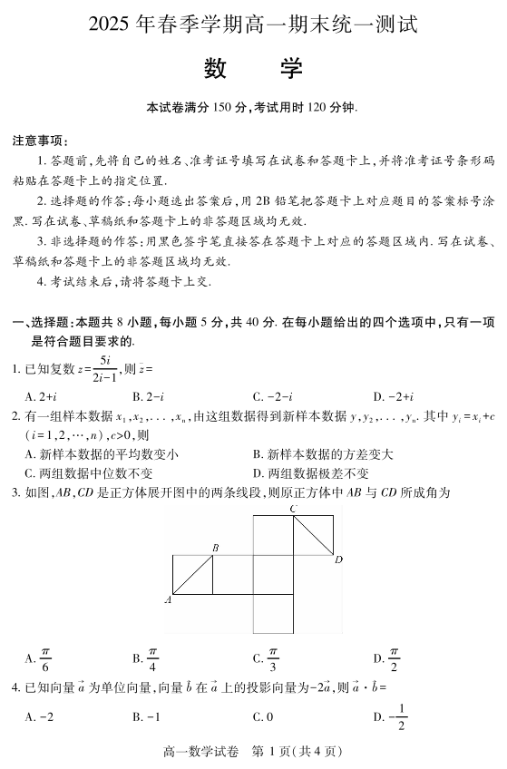 高一数学--湖北省黄石市2025春季学期高一期末统一测试