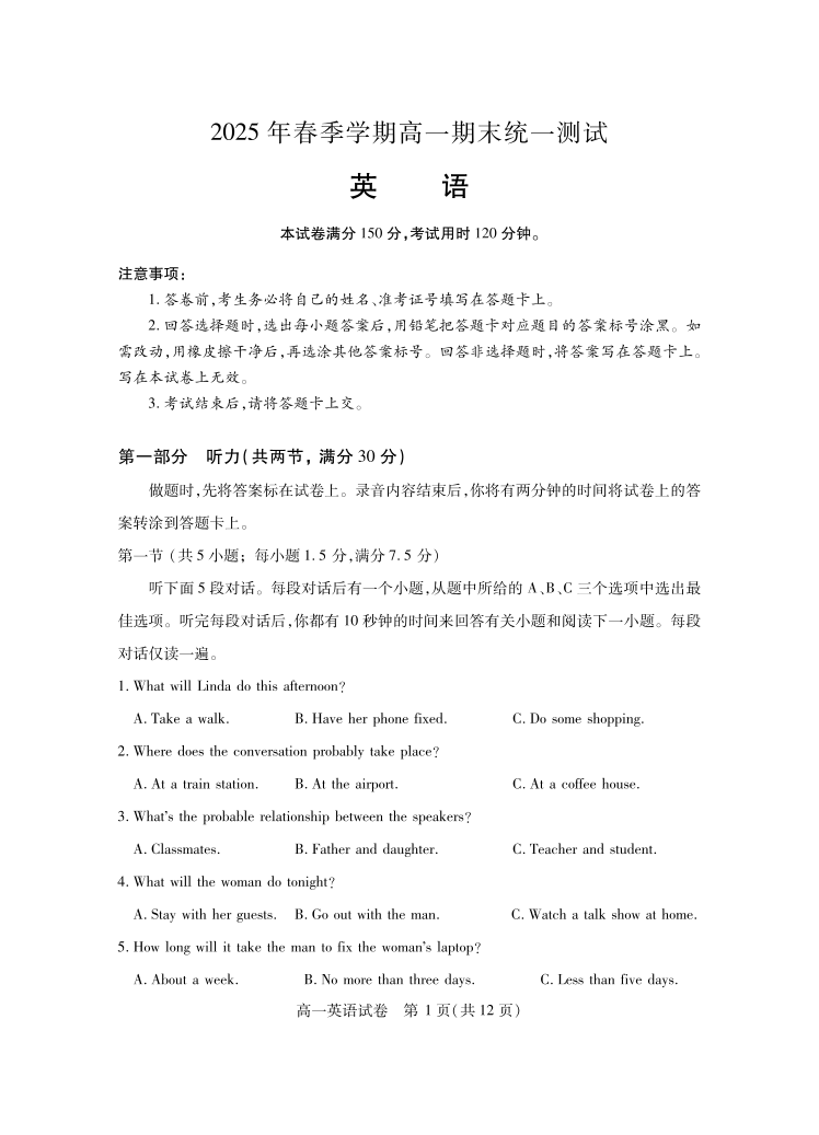 高一英语--湖北省黄石市2025春季学期高一期末统一测试