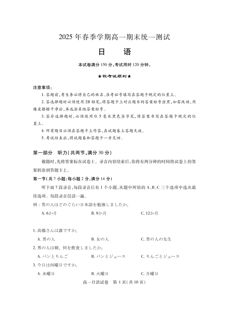 高一日语--湖北省黄石市2025春季学期高一期末统一测试
