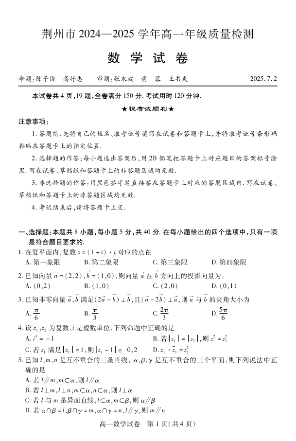 高一数学--湖北省荆州市2024-2025学年高一年级质量检测