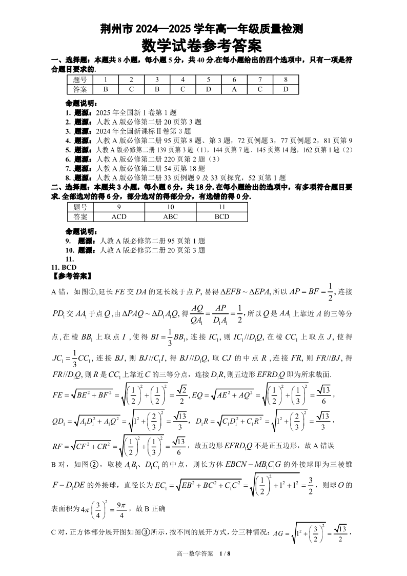 高一数学答案--湖北省荆州市2024-2025学年高一年级质量检测