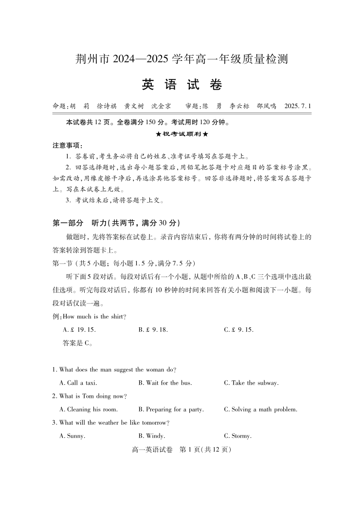 高一英语--湖北省荆州市2024-2025学年高一年级质量检测