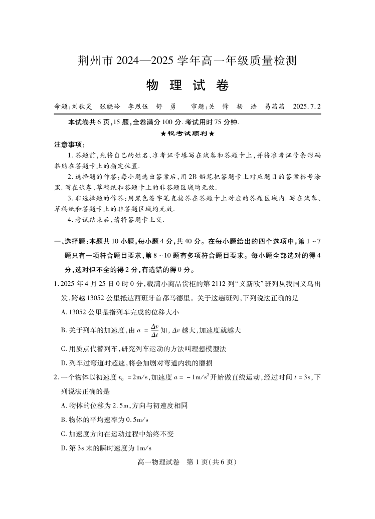 高一物理--湖北省荆州市2024-2025学年高一年级质量检测