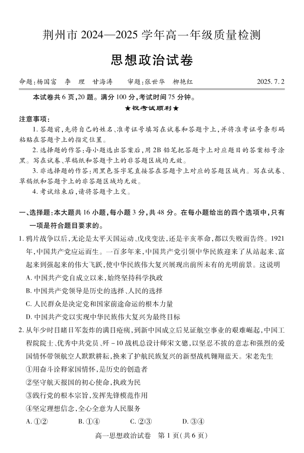 高一政治--湖北省荆州市2024-2025学年高一年级质量检测
