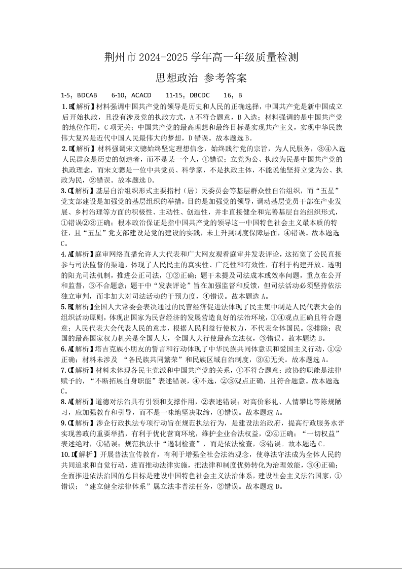 高一政治答案--湖北省荆州市2024-2025学年高一年级质量检测