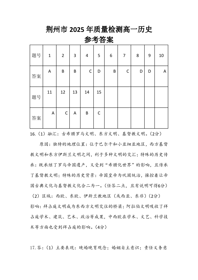 高一历史--湖北省荆州市2024-2025学年高一年级质量检测