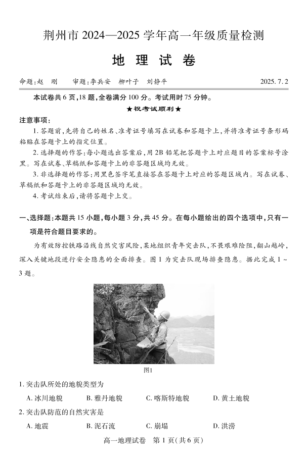 高一地理--湖北省荆州市2024-2025学年高一年级质量检测