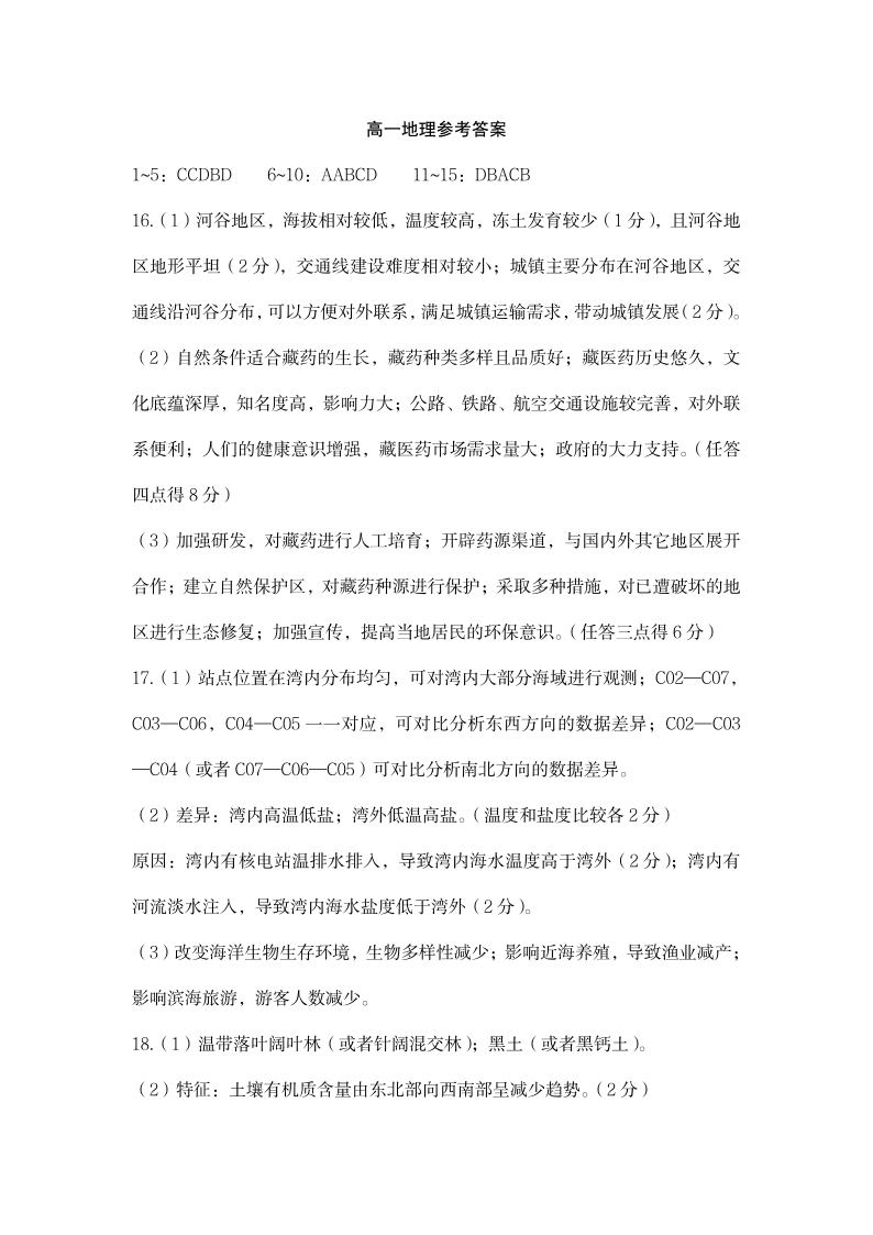 高一地理答案--湖北省荆州市2024-2025学年高一年级质量检测