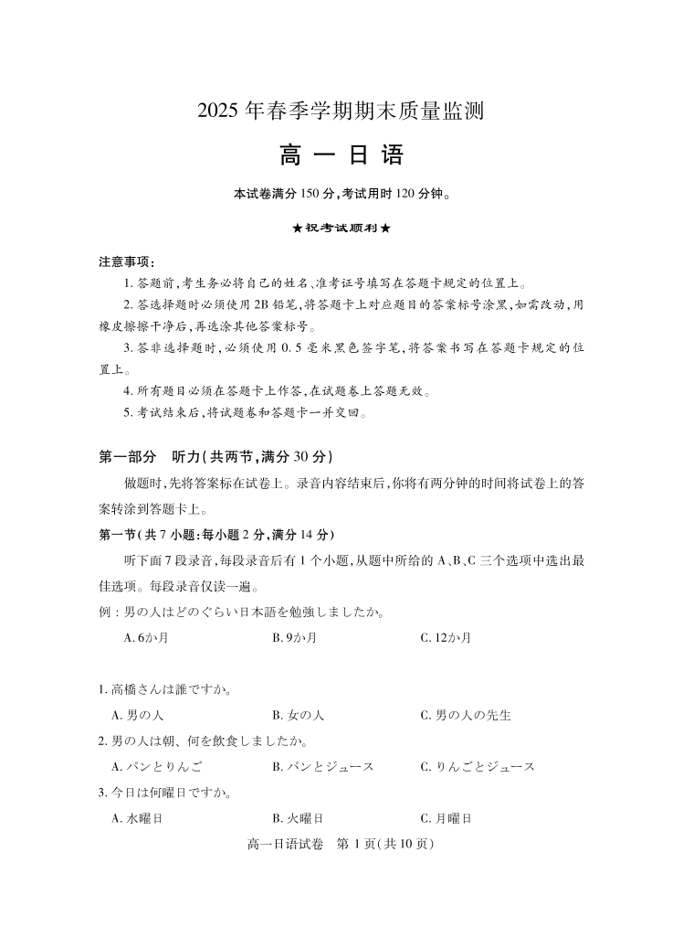 高一日语--湖北省荆州市2024-2025学年高一年级质量检测