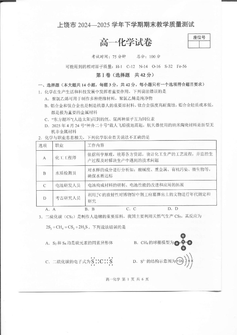 高一化学--江西省上饶市2024-2025学年高一下学期期末考试