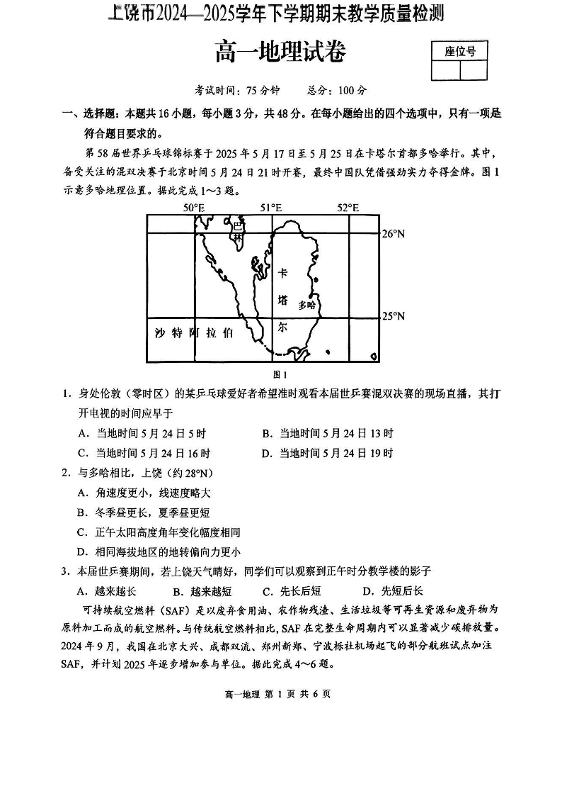 高一地理--江西省上饶市2024-2025学年高一下学期期末考试