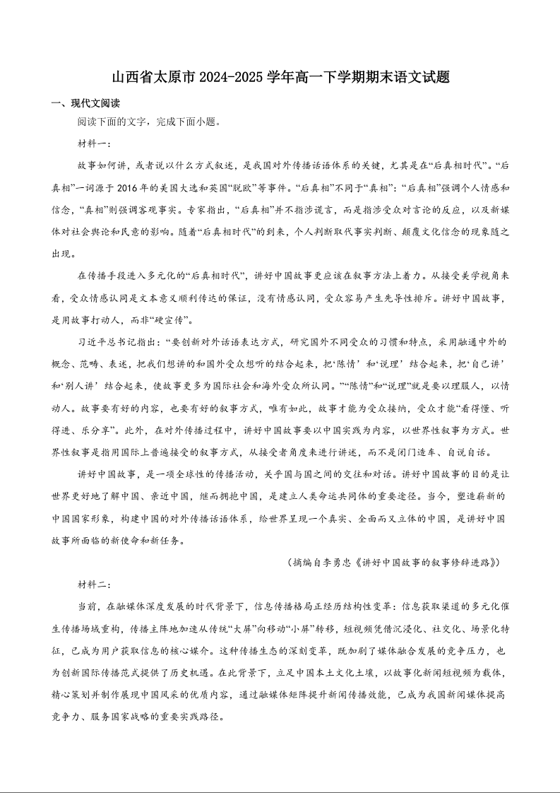 高一语文+答案--山西省太原市2024-2025学年高一下学期期末考试
