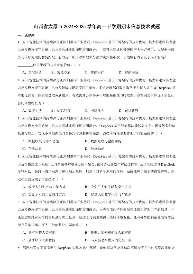 高一信息技术+答案--山西省太原市2024-2025学年高一下学期期末考试
