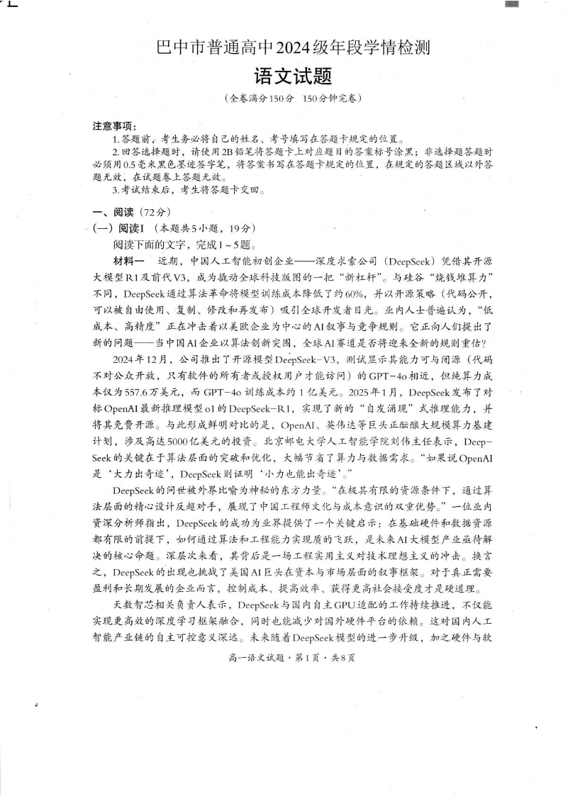 高一语文+答案+四川省巴中市普通高中2024-2025学年高一下学期学情检测(期末)