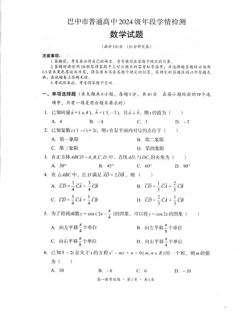 高一数学+答案--四川省巴中市普通高中2024-2025学年高一下学期学情检测(期末)