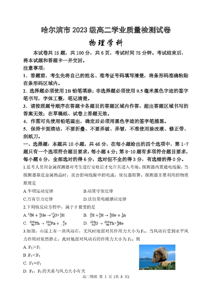 高二物理+答案--黑龙江省哈尔滨市2024-2025学年高二下学期期末质量检测