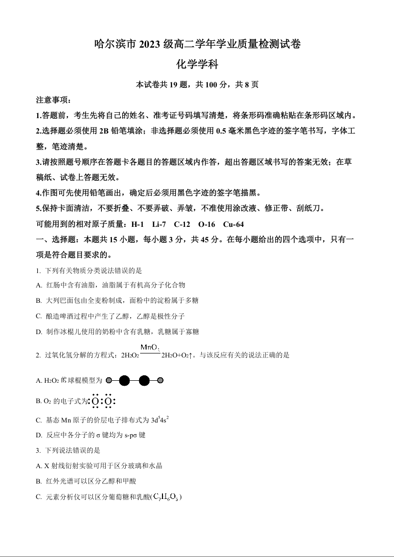 高二化学+答案--黑龙江省哈尔滨市2024-2025学年高二下学期期末质量检测