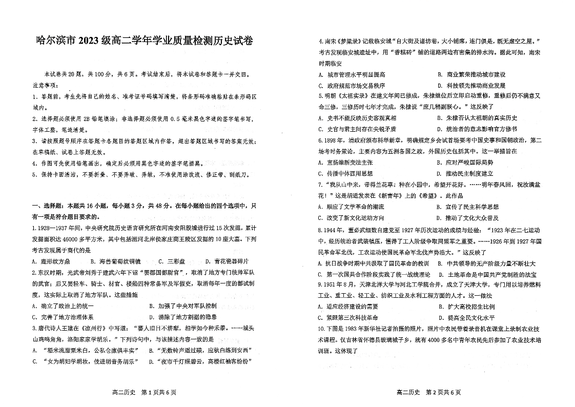 高二历史--黑龙江省哈尔滨市2024-2025学年高二下学期期末质量检测