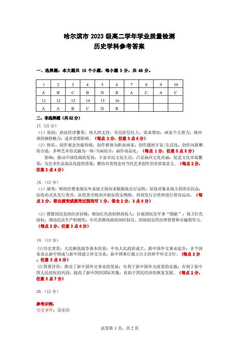 高二历史答案--黑龙江省哈尔滨市2024-2025学年高二下学期期末质量检测