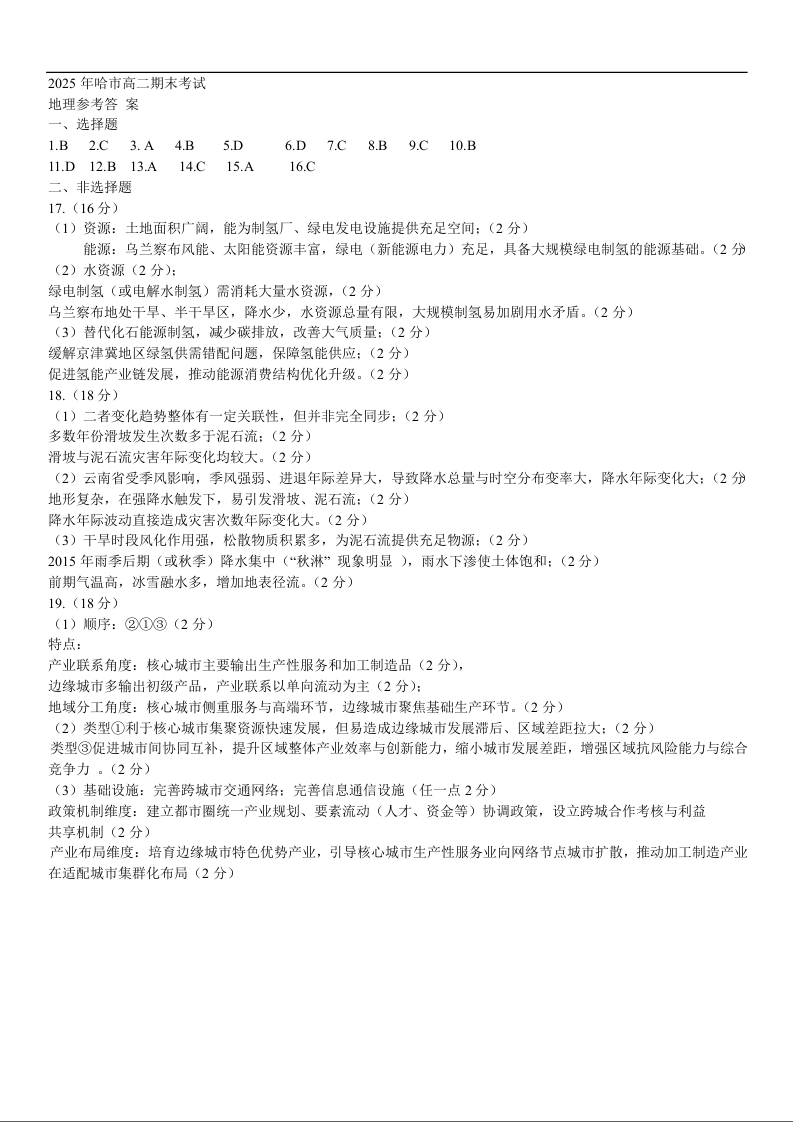 高二地理答案--黑龙江省哈尔滨市2024-2025学年高二下学期期末质量检测
