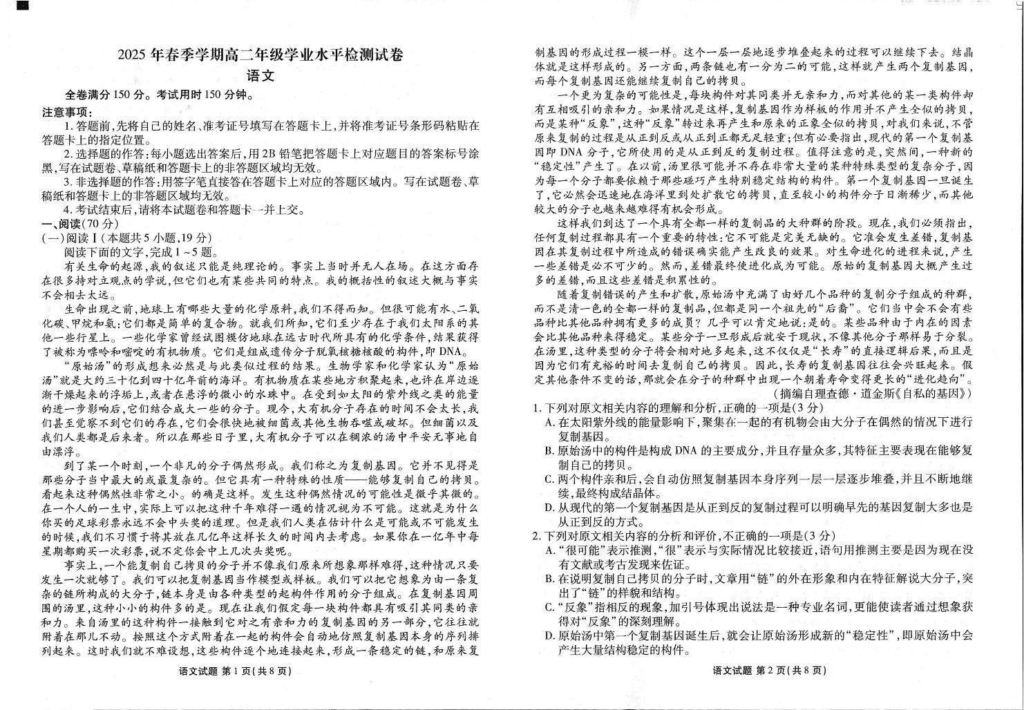 高一语文--云南省衡水金卷2025年春季学期高二年级学业水平检测试卷