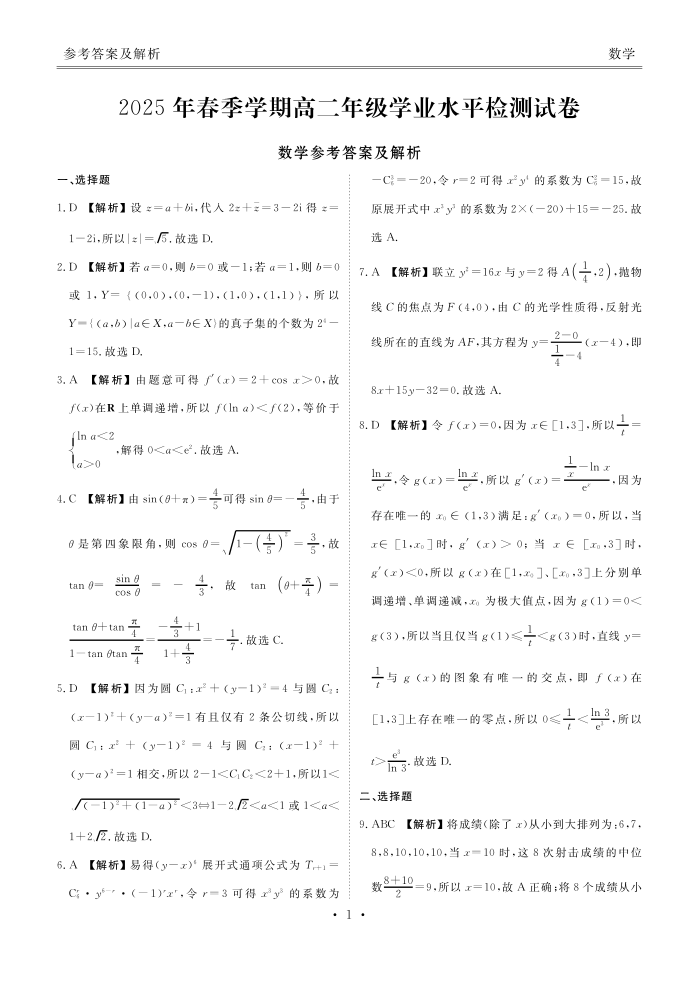 高一数学答案--云南省衡水金卷2025年春季学期高二年级学业水平检测试卷