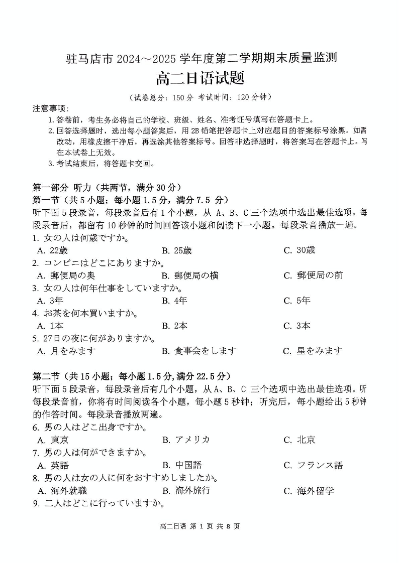 高二日语--河南省驻马店市2024~2025学年度高二第二学期月期末质量监测