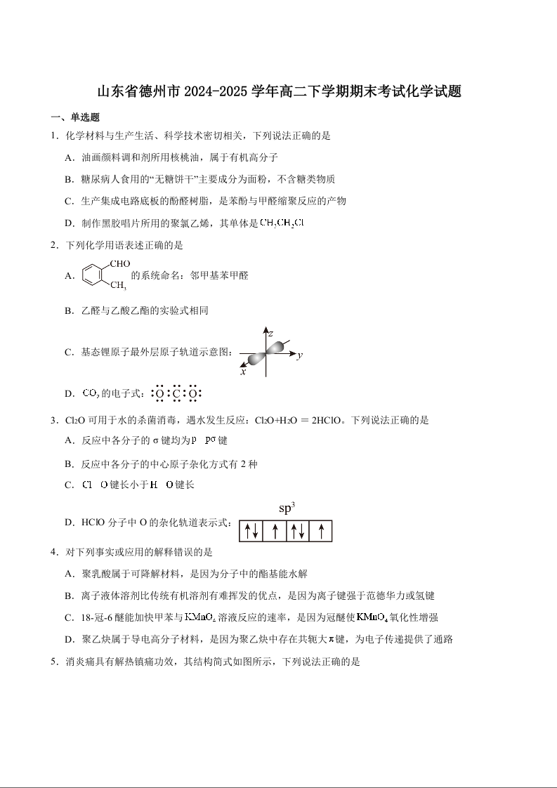 高二化学+答案--山东省德州市2024-2025学年高二下学期7月期末考试