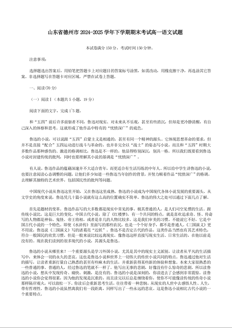高一语文+答案--山东省德州市2024-2025学年高一下学期期末考试