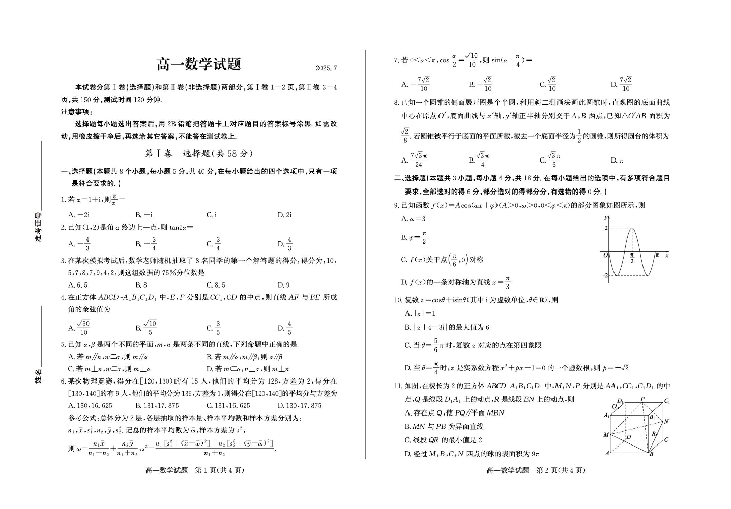 高一数学--山东省德州市2024-2025学年高一下学期期末考试