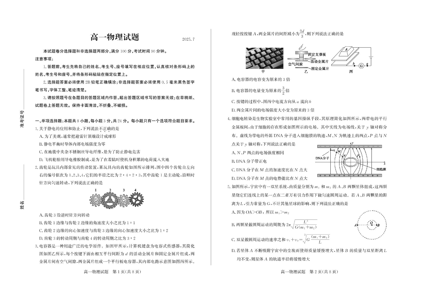 高一物理--山东省德州市2024-2025学年高一下学期期末考试